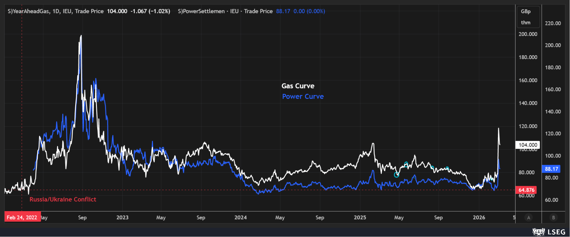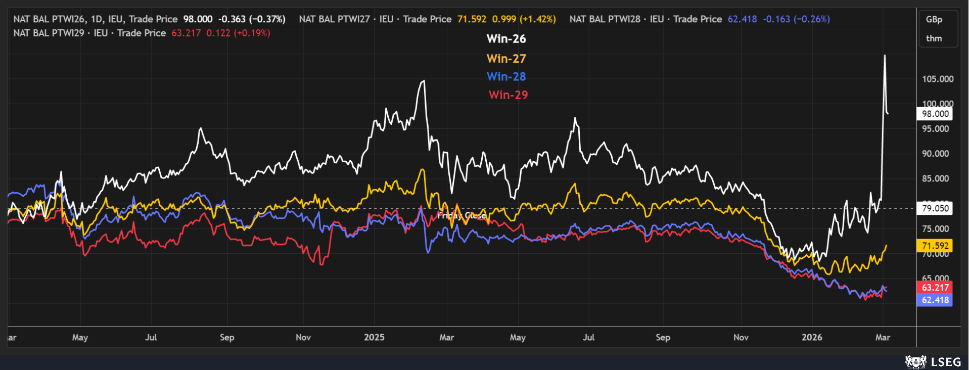 Power markets continue to take direction from gas, with the closure of the Strait of Hormuz impacting a fifth of global LNG supplies at the start of the summer injection season, where Europe is set to be reliant on LNG when refilling storages. The inverted Sum-26/Win-26 gas spread has passed through to the UK power market with the Sum-26 UK Baseload contract pricing at a £6.00/MWh premium to Win-26 at time of writing. Brent has seen some sideways price action in recent sessions with the market failing to break above $85.00/bbl. Currently Brent is pricing at $83.85/bbl at time of writing, up more than 14% since the conflict began.